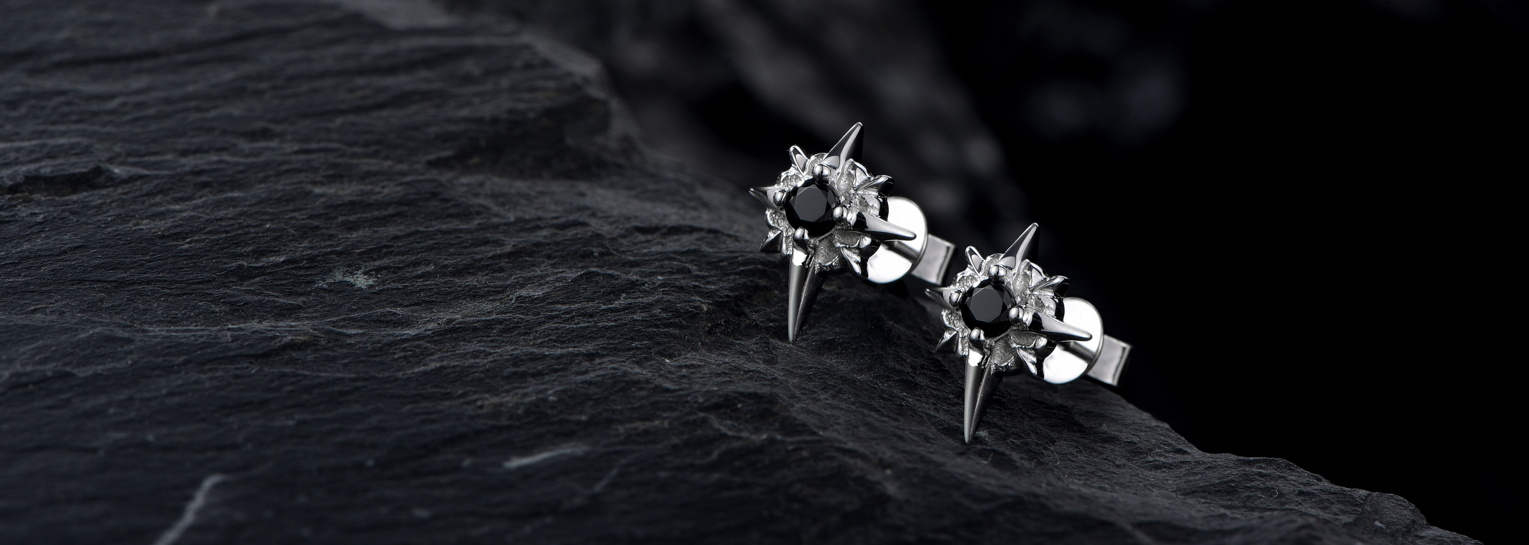 Unleash your edge with our 925 Sterling Silver spiked studs. Centered with a deep black gemstone, the radial thorn silhouette cuts through the ordinary—crafted for rebels who own the night.