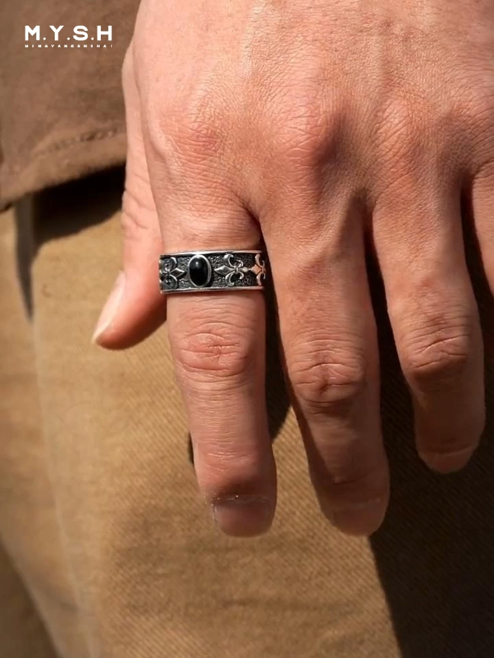 Solid 925 silver wide-band ring with hammered texture, fleur-de-lis carvings, black onyx accents, and engraved MYSH branding with star motifs inside. Matte brushed finish for vintage-tough edge — bold, masculine, and quietly luxurious. Perfect for everyday wear, stacking, or adding serious attitude and refined dark heritage style to your look.