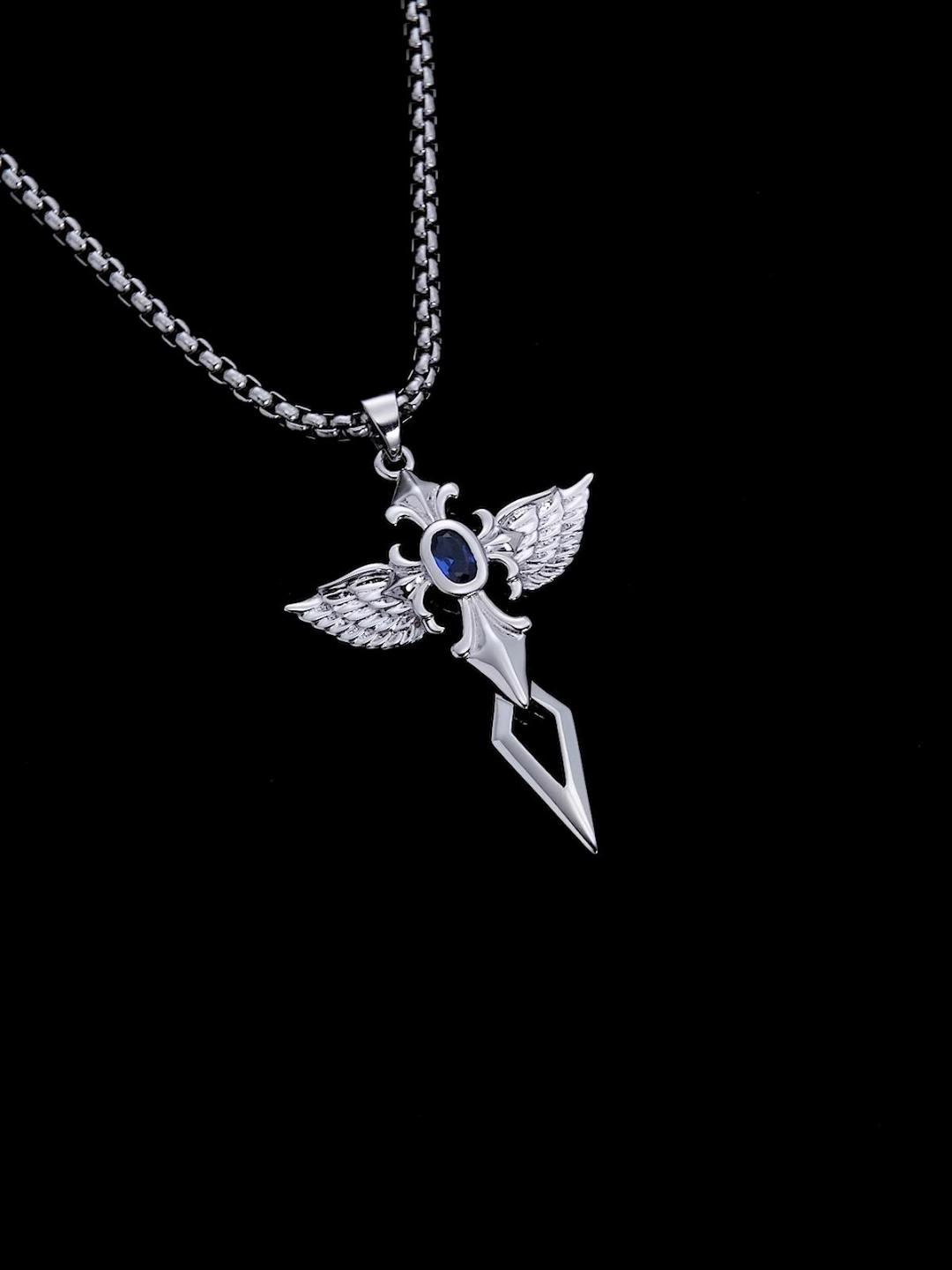 S925 Silver winged blades fuse with a sharp cross, centered by a deep sapphire like an angel’s gaze – cold power and mystery whisper at your neck, commanding yet restrained guardian energy.